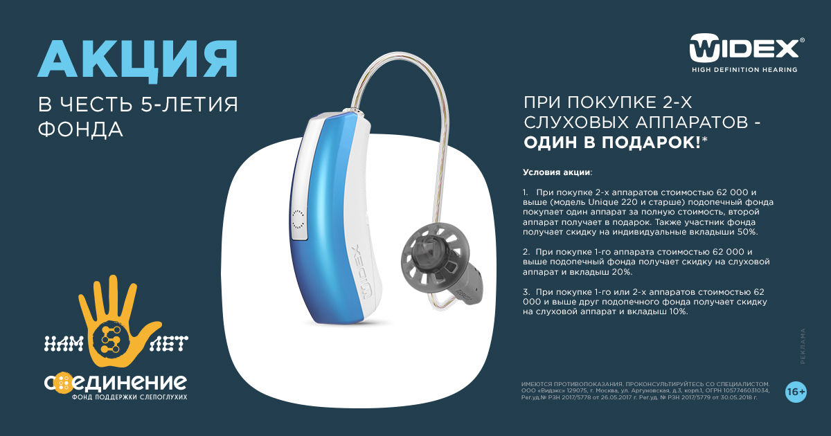 Акция проходит во всех офисах компании Widex с 8 апреля до 30 июня. При покупке слуховых аппаратов необходимо сказать, что Вы пришли от Фонда "Со-единение", только в этом случае условия акции будут действовать.