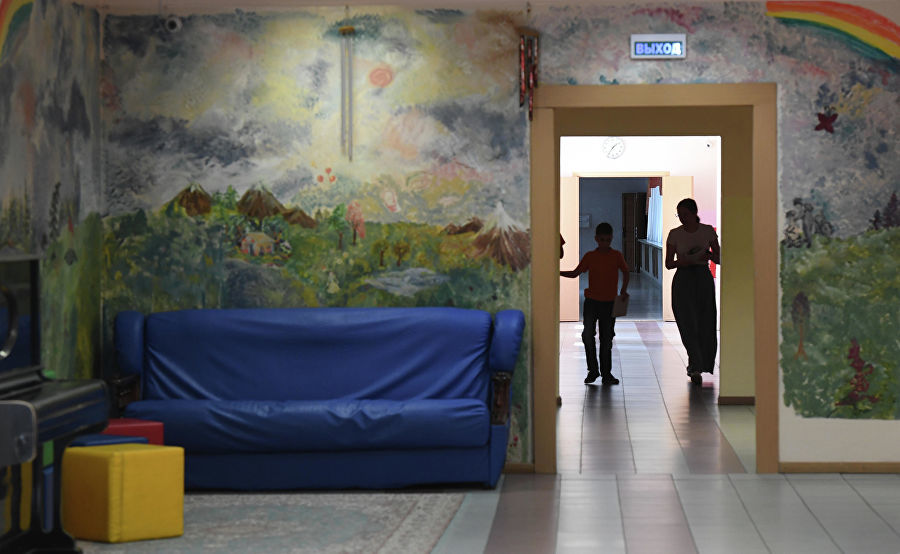 Педагог кладет руку Алены себе на горло, спрашивает, сколько лет она уже учится в интернате.