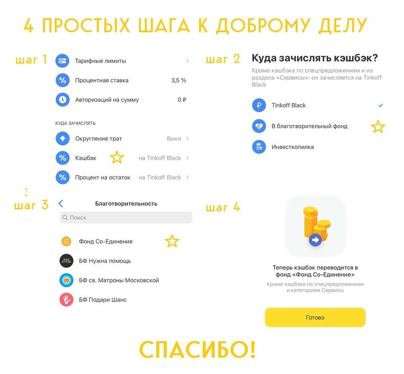 Воспользуйтесь социальным сервисом от компании «Тинькофф» «Кэшбэк во благо». Все владельцы карт банка могут перечислять проценты на счёт одной из 200 благотворительных организаций. Среди них есть и Фонд «Со-единение».